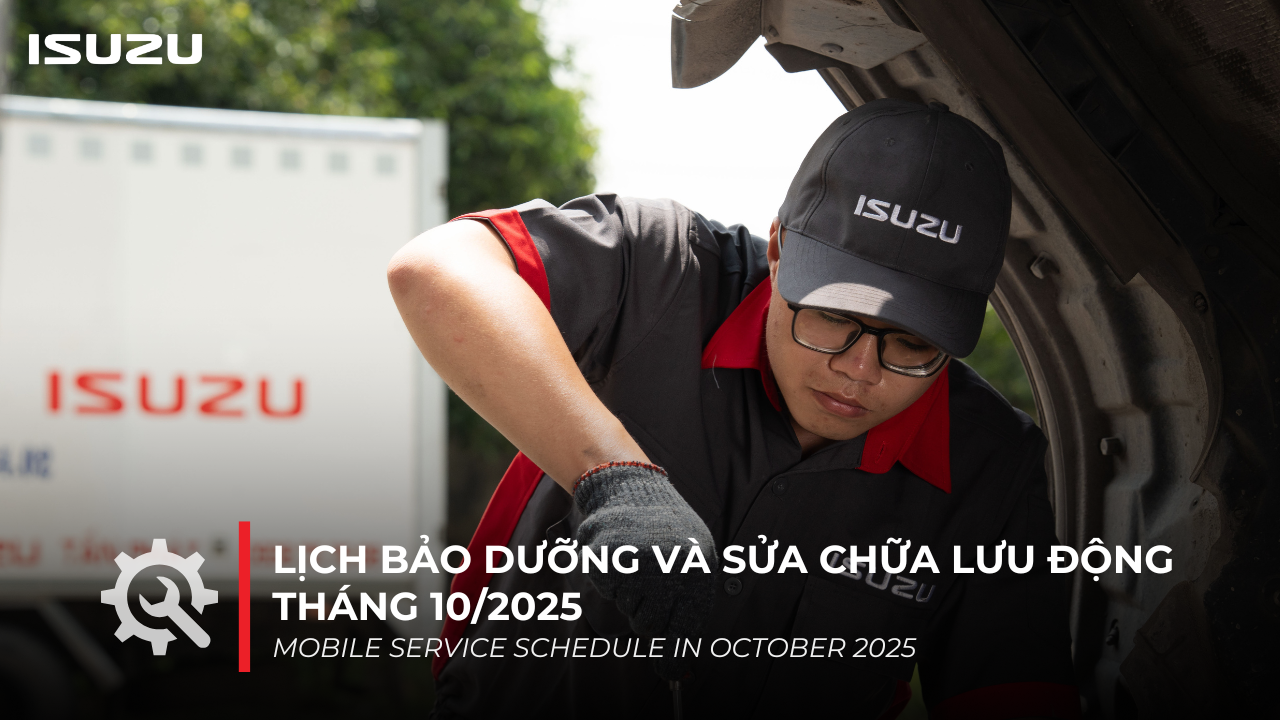 Nhằm tri ân khách hàng đã tin dùng sản phẩm cùng với mong muốn được đồng hành và chăm sóc cho xe được vận hành trong điều kiện hoàn hảo nhất. ISUZU Việt Nam xin gửi đến Quý Khách hàng lịch trình tổ chức chương trình “Sửa chữa và bảo dưỡng lưu động” trong tháng 10 năm 2025.